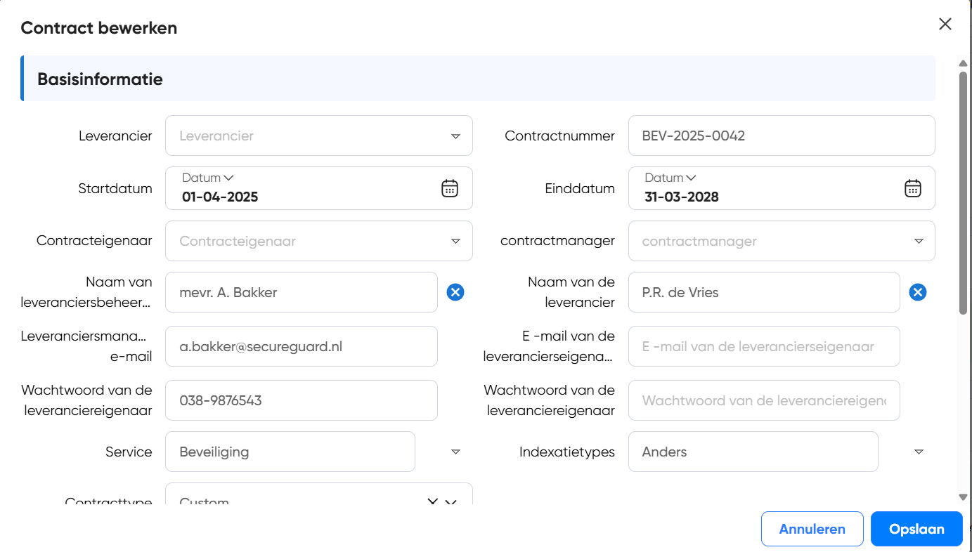 Na succesvol opslaan sluit het formulier en zie je de bijgewerkte contractdetails