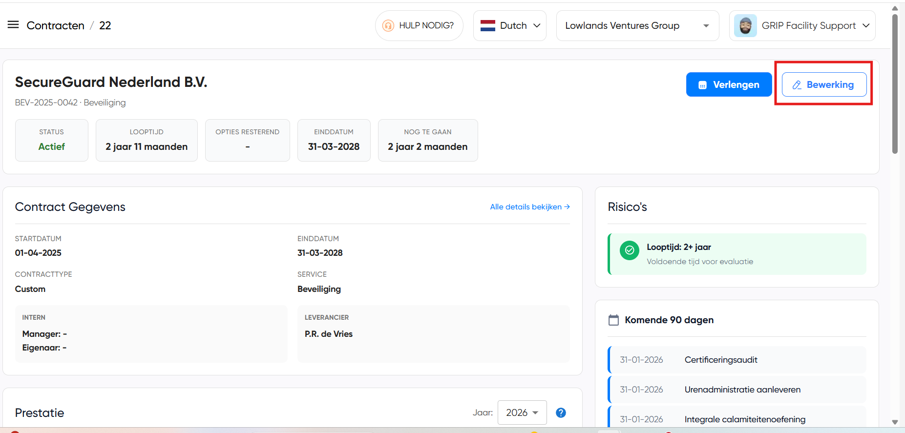 [SCREENSHOT: Contract detailpagina met “Bewerking” knop rechtsboven]
