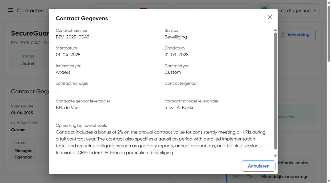 De sectie “Contract Gegevens” toont een samenvatting van de belangrijkste contractinformatie: