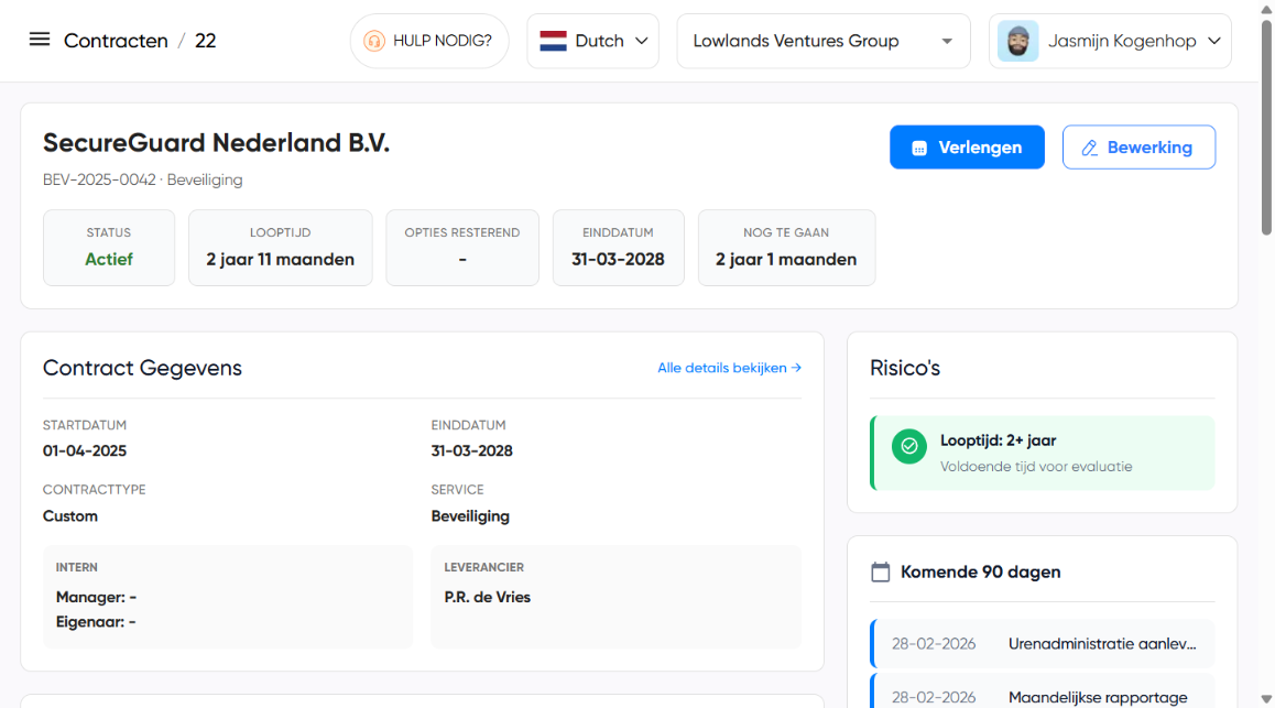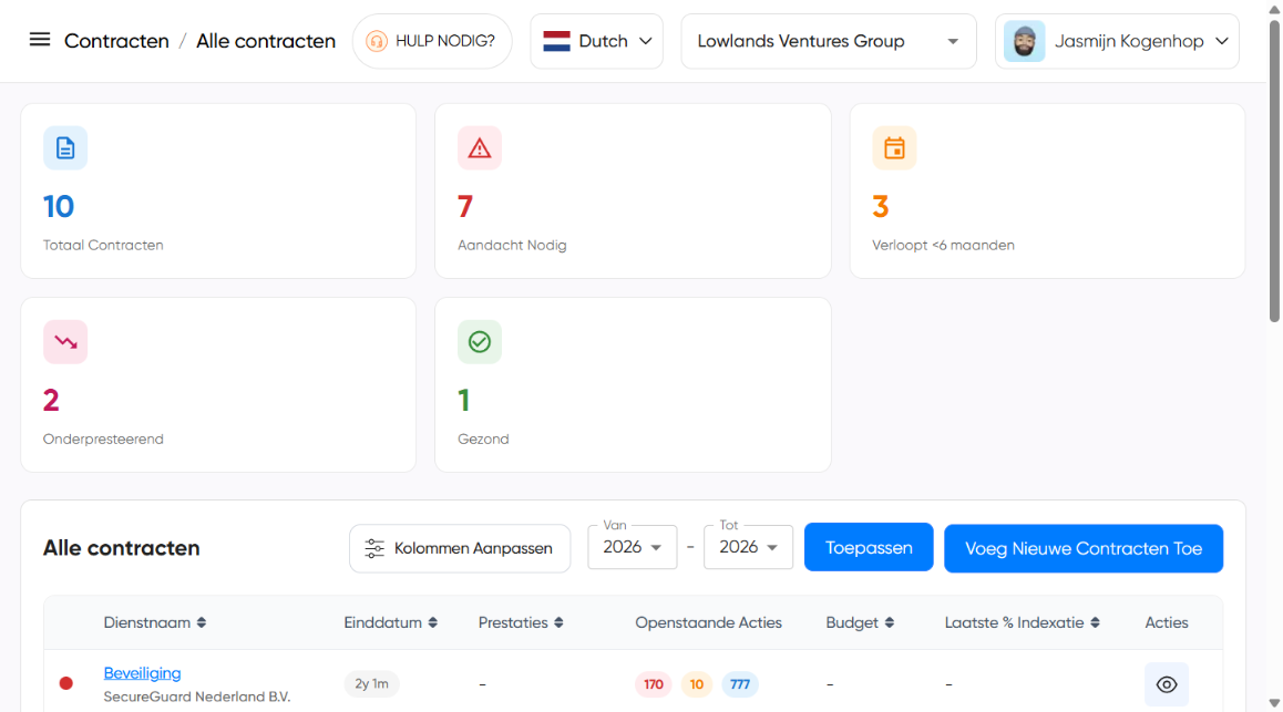 Na het lezen van deze handleiding kun je de volledige contractdetailpagina in GRIP begrijpen en effectief gebruiken. Je leert waar je alle contractinformatie kunt vinden, hoe je de verschillende secties interpreteert, en hoe je snel toegang krijgt tot belangrijke gegevens zoals acties, prestaties, documenten en risico’s.