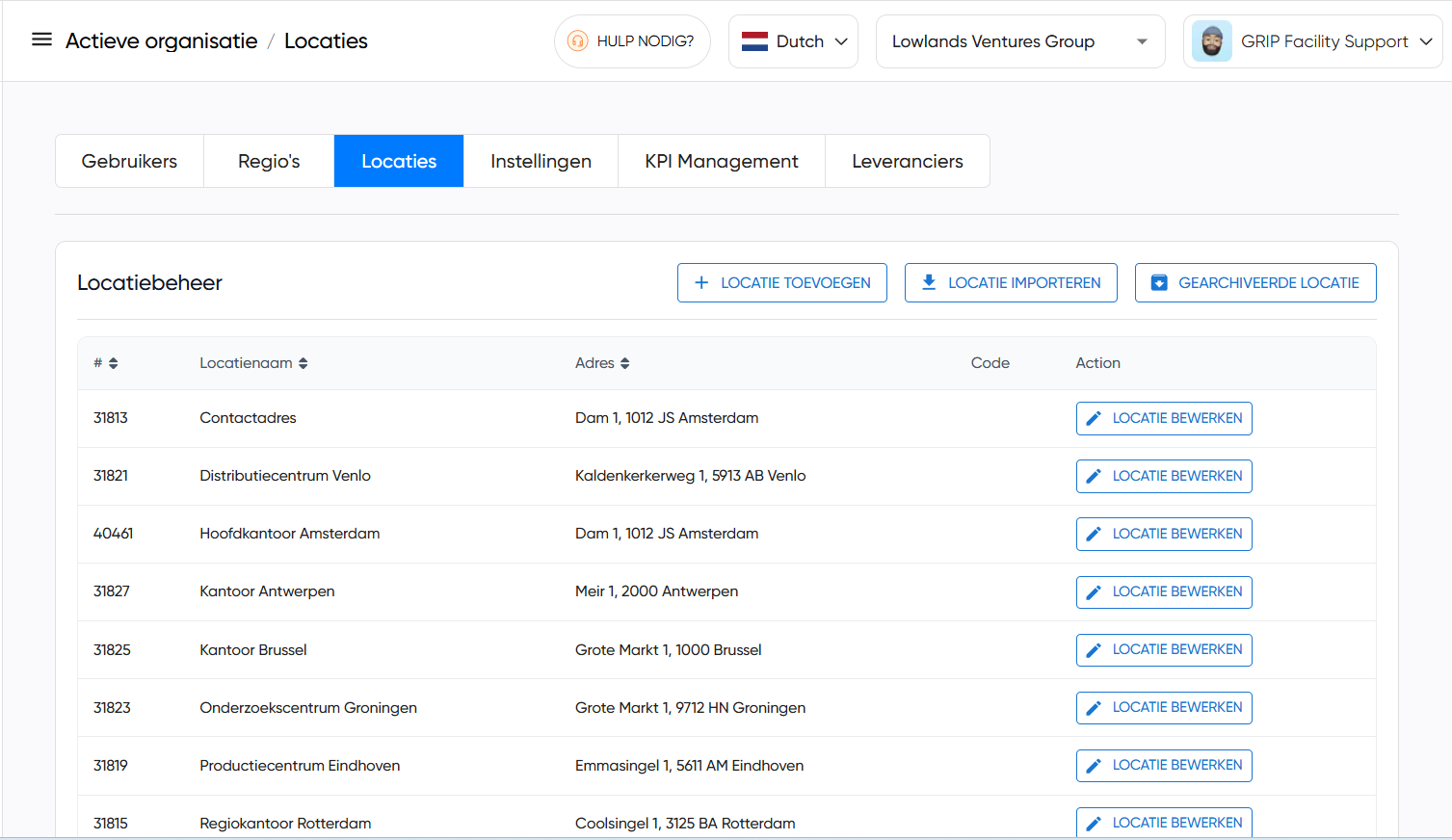 Voor het toevoegen van gebruikers en locaties is ‘Bedrijfsadmin’ toegang vereist. Inloggen kan via de URL: https://portal.grip-facility.com/.