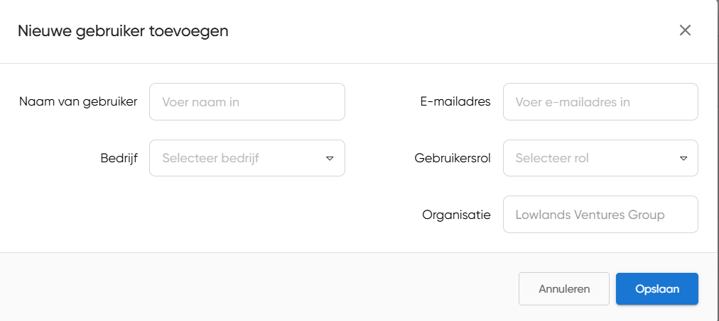Vul de naam, het e-mailadres, het bedrijf en de rol van de gebruiker in. Na het klikken op 'Opslaan' wordt er automatisch een e-mail verstuurd naar de gebruiker met een link om het account te activeren: